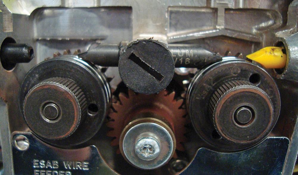 Most wire feeders have “floating” drive rolls. This means they have a little bit of side-to-side movement, allowing the wire to basically guide the rolls into alignment. However, if anything becomes lodged between the drive roll and the face of the gear, the roll may not float anymore, and the edges of the wire grooves could deform or gouge the wire. A simple way to prevent this is to pull the rolls off with every one or two wire spool changes and make sure the rolls and gear face are clean.